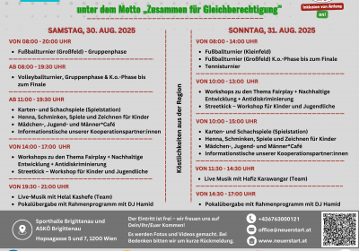 📅 30.–31. August 2025📍 Sporthalle Brigittenau & ASKÖ Brigittenau, Hopfengasse 5 und 7, 1200 Wien Unter dem Motto „Zusammen für Gleichberechtigung“ lädt der Verein NEUER START gemeinsam mit zahlreichen Partner:innen herzlich zum 12. Integrationsfestival Von Kabul bis Wien ein. Das Festival versteht sich als Plattform für Begegnung, Vielfalt und Zusammenhalt. Zwei Tage lang erwartet die Besucher:innen ein abwechslungsreiches Programm mit Sport, Kultur, Musik und Workshops für alle Generationen: Highlights im […]