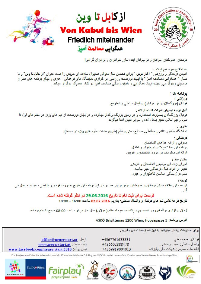 انجمن فرهنگی و ورزشي ” آغاز نوین ” برای ششمین سال متوالی فستیوال سالانه ای خویش را تحت عنوان “از کابل تا وین” و با شعار ” همگرایی مسالمت آمیز ” با ایجاد تورنمنت ورزشی, بر گزاری نمایشگاه های فرهنگی – هنری و دیگر برنامه های متنوع موسیقی وسرگرمی, جهت ایجاد همگرایي و داشتن زندگی مسالمت آمیز در کنار همدیگر برگزار میکند.