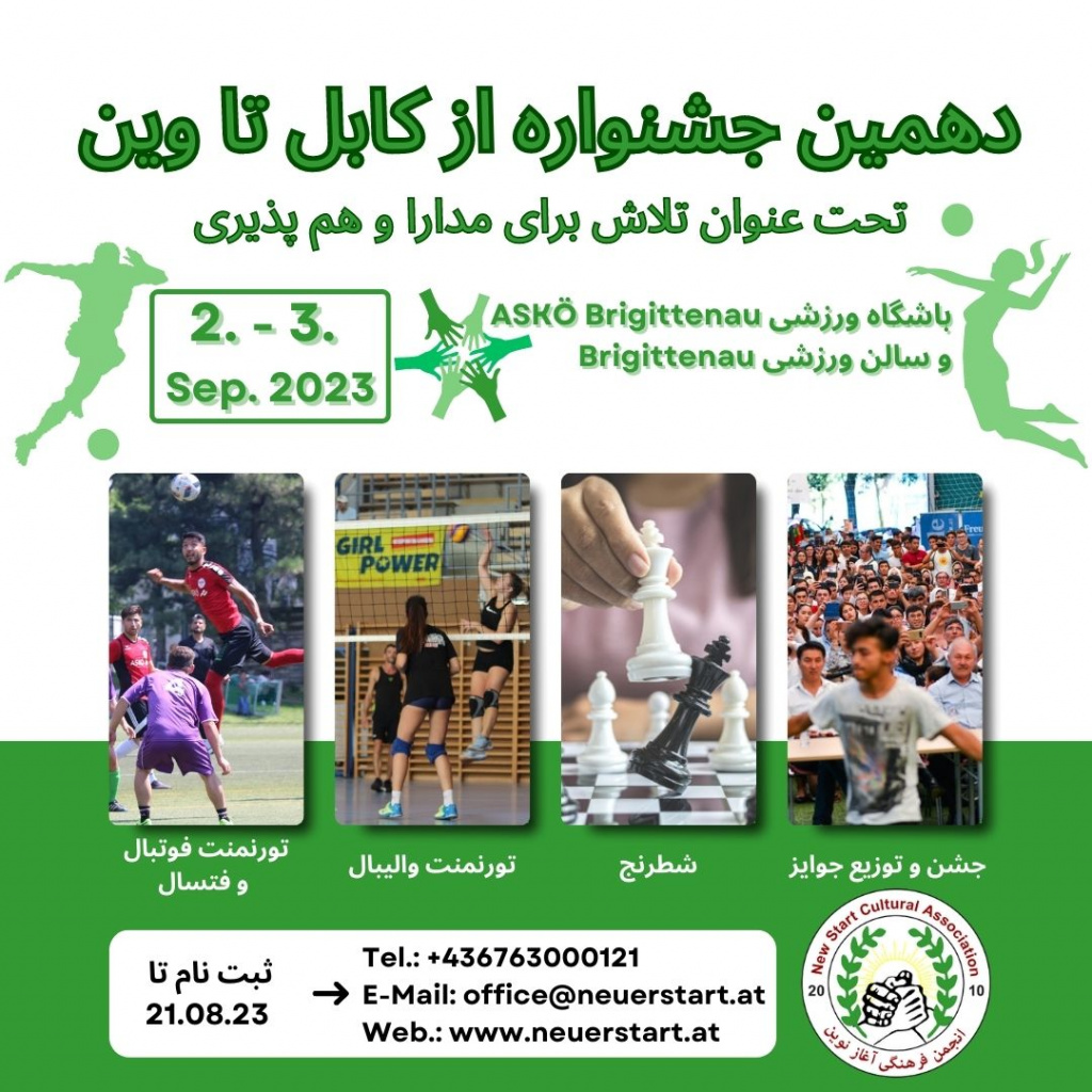 انجمن فرهنگی و ورزشی آغاز نوین افتخار دارد که دهمین جشنواره از کابل تا وین را تحت عنوان “مبارزه برای مدارا و هم پذیری” از دوم تا سوم سپتامبر سال جاری در بزرگترین سالن ورزشی شهر وین و فضای ورزشی ASKÖ منطقه 20 شهر وین برگزار