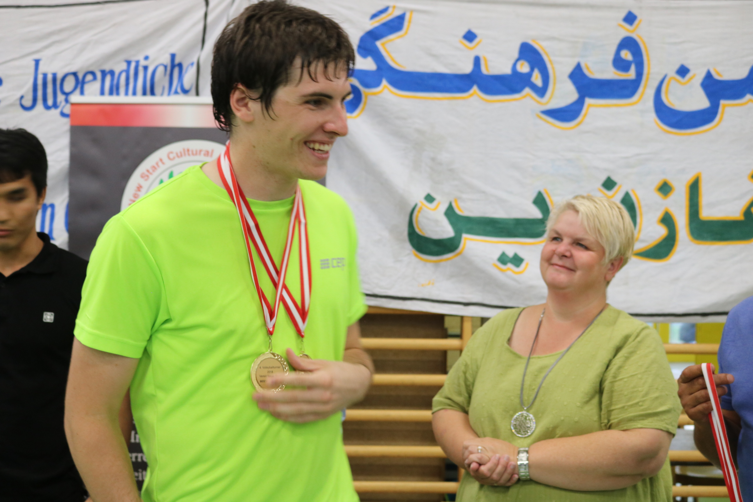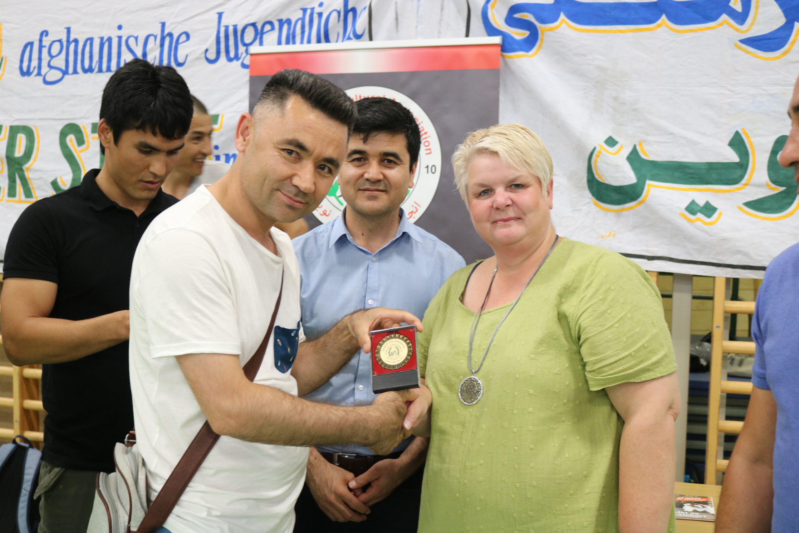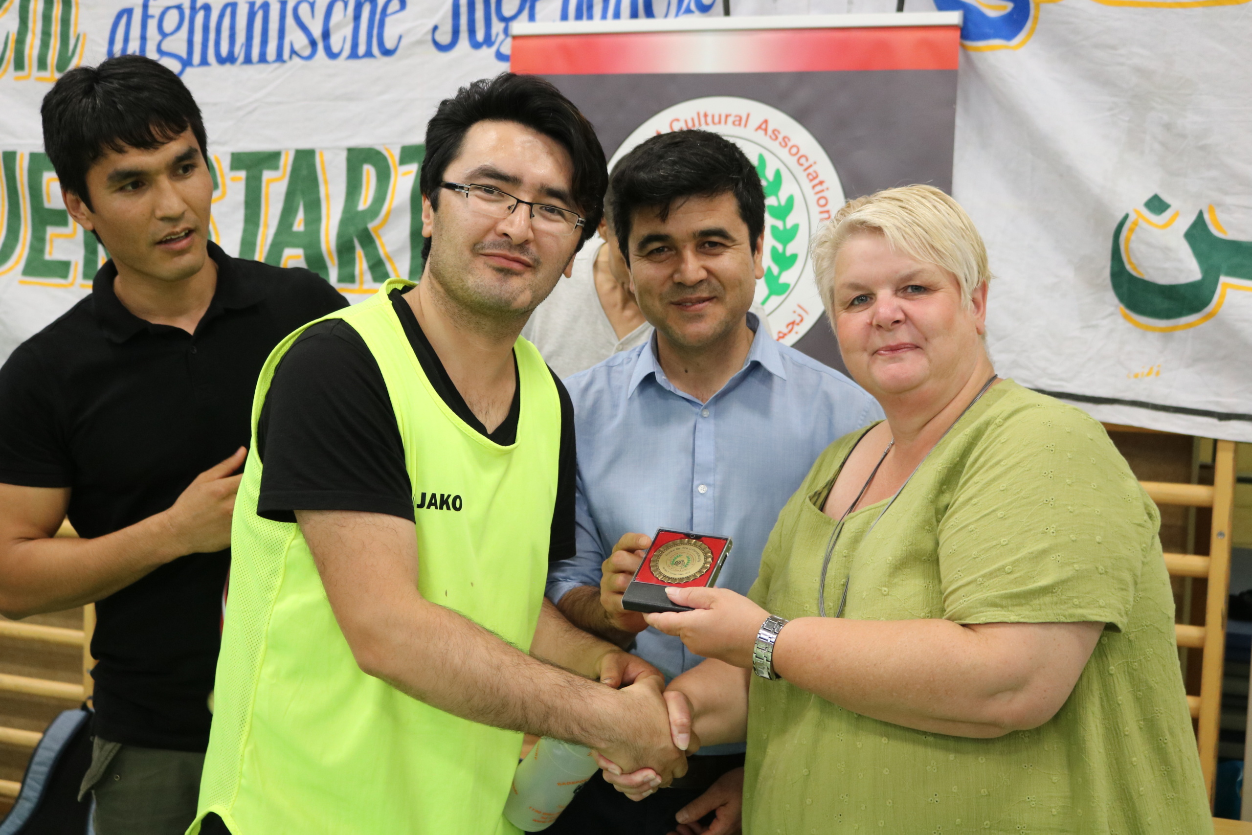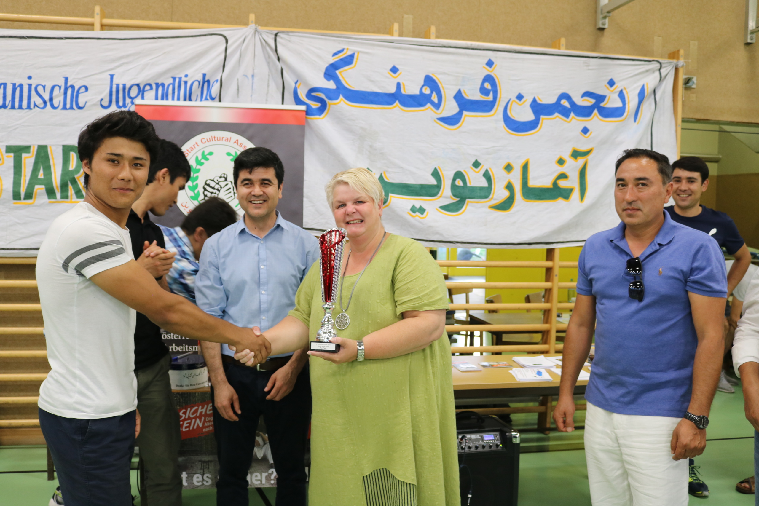 جایزه ی اخلاق هم به تیم “عقاب وین 2” رسید. و آقایان هریک امید از تیم آریانا , نور الله سلطانی از تیم امید, Gabriel از تیم عقاب 2, میرویس از تیم اتحاد لینز, Fillix از تیم SPU به عنوان بازیکنان شایسته و آقای محمدی از تیم Unity به عنوان بهترین پاستور در این تورنمنت شناخته شد و مورد تقدیر و تشویق قرار گرفتند. و همچنان از عکاس ماهر آقای حبیب نظری و آقای اشکان رضایی بابت همکاری صادقانه شان قدردانی شد و از قلم نماند که آقای سخیداد دانش عکاس خوب و بسیار فعال ما متأسفانه در زمان تقدیر حضور نداشتند که از ایشان هم صمیمانه تقدیر و تشکر مینماییم. خانم Halla عضو شورای منطقه 22 وین از حزب سوسیال دموکرات؛ اقای عالمی تاجر موفق؛ اقای غروال ورزشکار موفق؛ اقای نظری معاوین شورای نمایندگی اتریش؛ اقای کاروانگر مربی تکواندو؛ اقای آرش ورزشکار موفق و اقای شایان مسئول عمومی انجمن اغاز نوین با حضور در این برنامه جوایز را به برندگان اهدا کردند. خانم Halla از برگزاری این جام در منطقه ۲۲ ابراز خرسندی کرده و تمایل خود را به همکاری بیش تر با انجمن ابراز کردند. و همچنان آقای شایان از همه ی حضار و تیم های شرکت کننده و مهمانان صمیمانه تشکر و قدردانی کردند.