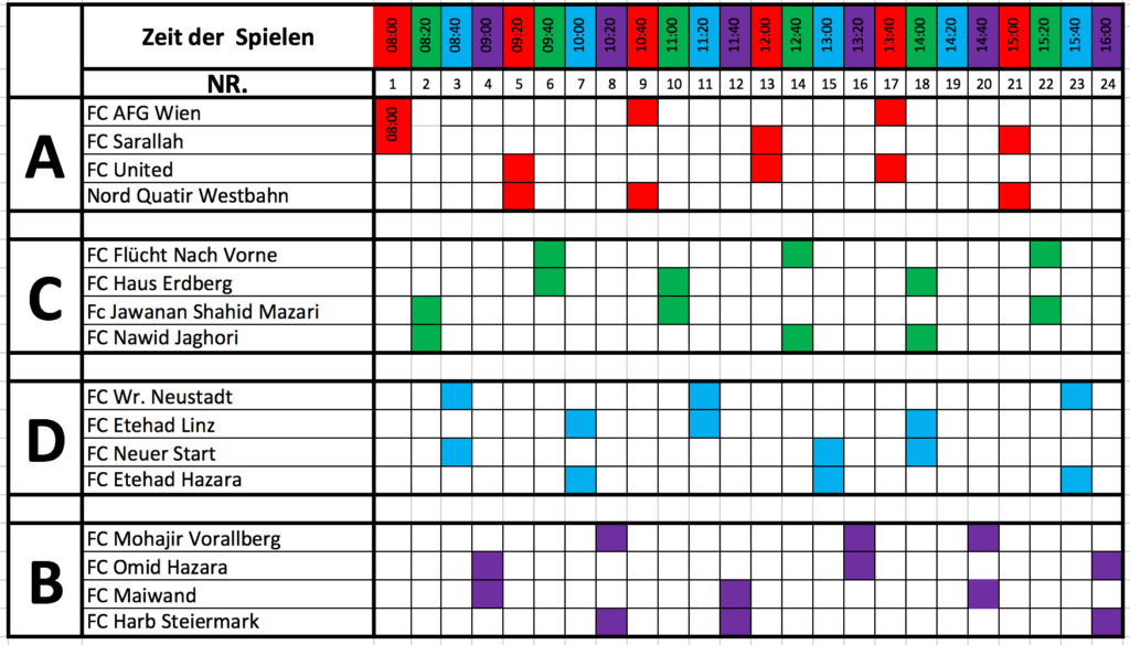 تيم برگزاري جشنواره از کابل تا وین تحت عنوان همگرايي مسالمت آميز اين جشنواره را که شامل برنامه های متنوع ورزشی ـ فرهنگی و هنري است، به شکل قانونی ثبت راجستر ادارات دولتي مانند (شاروالی – ماگسترات 36)، اداره پولیس ، کمیته ورزش و کمیته های فرهنگی وهنری اتریش گردیده اند وبشکل کاملا قانونی باهمکاری انها برگزار میگردد امروز شنبه مورخ 02.07.2016 عده ی زیادی جوانان – مربیان و مسولين 32 تیم فوتبال وسایر بخش های هنری فرهنگی بخاطر هماهنگی هرچه بیشتر برنامه ها گرد هم امدند. مرحله قرعه کشی تیم هارا تنظیم نمودند. و در هشت گروپ تقیسم شده اند که چهار گروپ اولی A,B,C,D در چمن اصلی بازی میکند وچهار گروپ دیگر E,F,G,H در چمن مصنوعی بازی میکند ، ولازم به یاد آوری است که تمام تیم هایکه در چمن اصلی یامصنوعی بازی میکند باید کفش متناسب به زمین را داشته باشند، ومطابق به جدول بندی زمانی در ساحه حضور داشته باشند، که این برنامه در روز شنبه مورخ 9/7/2016 راس ساعت 7:30 دقيقه صبح توسط الفرد شون افتتاح میگردد تا روز يكشنبه ادامه می یابند.