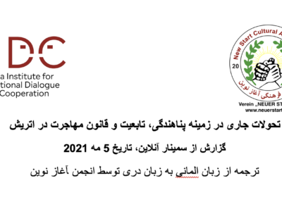 گزارش از سمینار آنلاین،تاریخ 5 مه 2021 ترجمه از زبان المانی به زبان دری توسط انجمن آغاز نوین اخراج اجباری و حق اقامت اخراج یا دیپورت اجباری چیست؟ چگونه این کار انجام می شود؟ چه کار می توان در مقابل آن انجام داد؟ اخراج اجباری حکم ترک کشور برای افرادی است که اجازه اقامت ندارند (یا حق اقامت از آن ها سلب شده […]