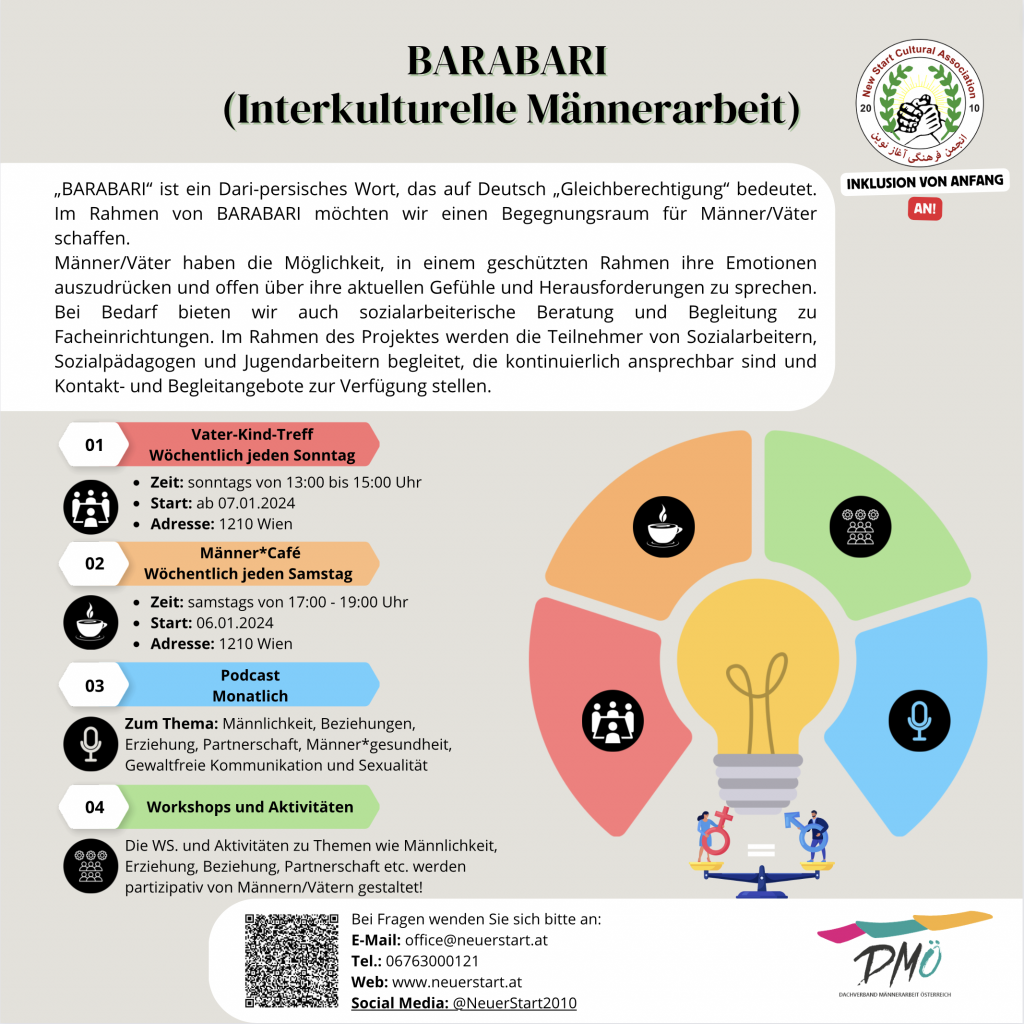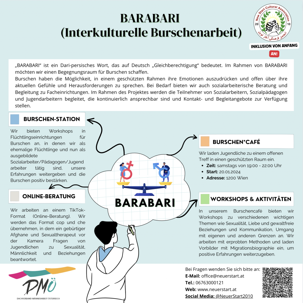 „BARABARI“ ist ein Dari-persisches Wort, das auf Deutsch „Gleichberechtigung“ bedeutet. Im Rahmen von BARABARI möchten wir einen Begegnungsraum für Burschen-/Männer/Väter schaffen.