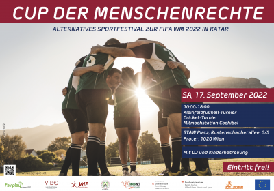 Datum: Samstag, 17. September 2022 (10:00-19:00 Uhr)  Ort: STAW Platz, Rustenschacherallee 3-5 (Prater), 1020 Wien  Vor der umstrittenen FIFA WM 2022 in Katar organisieren wir eine alternative WM. Beim „Cup der Menschenrechte“ wird neben Fußball auch Cricket und Mamanet-Cachibol gespielt. Und zwar von Gruppen und Personen, die durch die WM in Katar zu den Betroffenen gehören. Statt Ausbeutung und Menschenrechtsverletzung […]