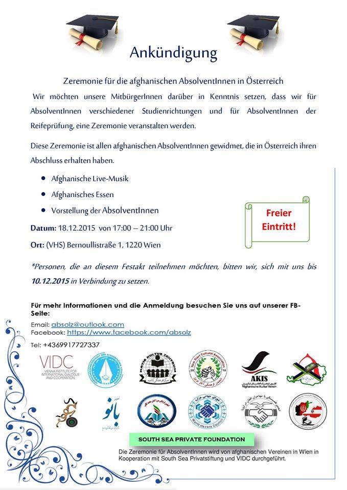 Wir möchten Sie hiermit für die „Zeremonie für die afghanische AbsolventInnen“, die am 18. Dezember 2015 im „Haus der Begegnung“ in der 1220 Wien, Bernoullistraße 1 stattfinden wird, einladen.
